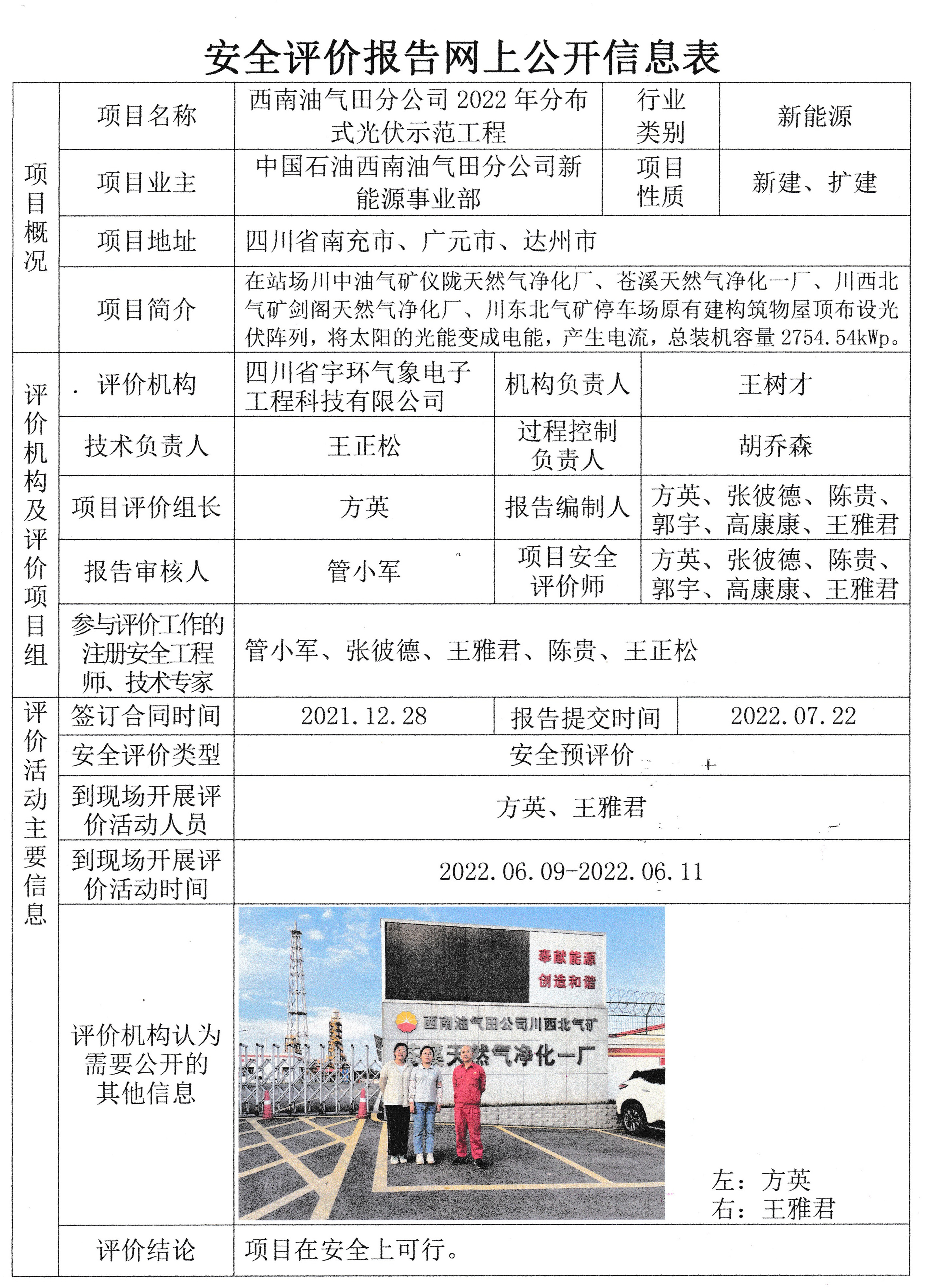 西南油气田分公司2022年分布式光伏示范工程安全预评价