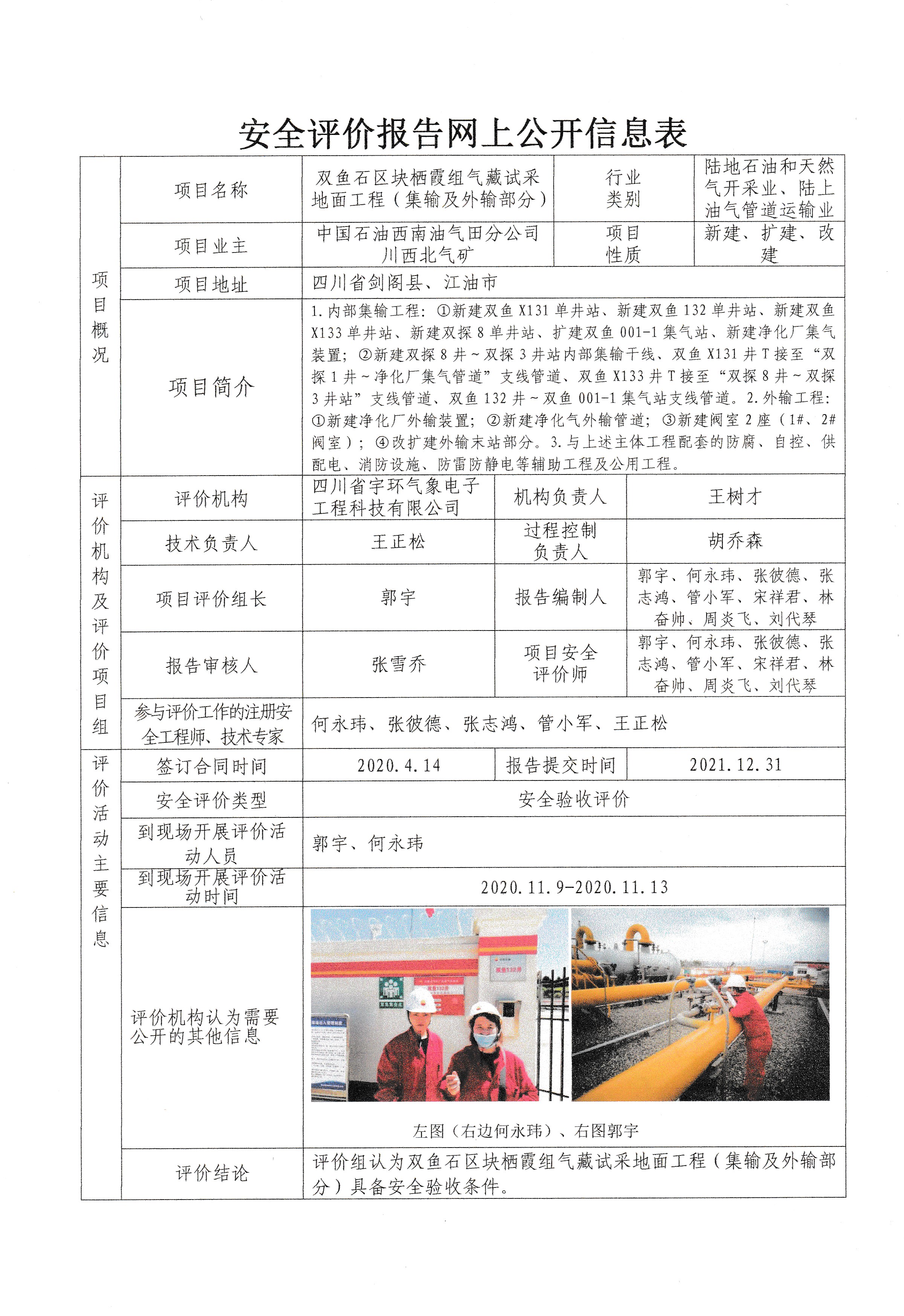 双鱼石区块栖霞组气藏试采地面工程(集输及外输部分)安全验收评价